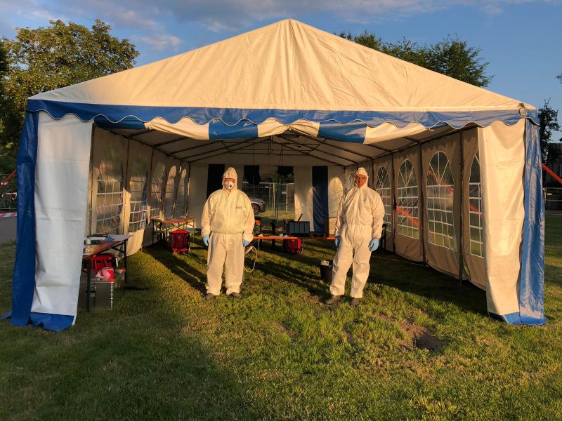 Gütersloh/Warendorf/Steinfurt. Viele hundert Einsatzkräfte der Hilfsorganisationen, des THW und der Bundeswehr waren auch am Sonntag in den Kreisen Gütersloh, Warendorf und Steinfurt im Einsatz. Das Fieberlazarett in Laer im Kreis Steinfurt, das von Einsatzeinheiten der Malteser und DRK betrieben wird, ist einsatz- und aufnahmebereit. Aktuell sind immer jeweils 15 Einsatzkräfte von DRK und Maltesern im 3-Schichtsystem („24/7“) im Dienst. Vor Ort sind auch Dolmetscher, Sicherheitsdienstmitarbeiter und Polizei. Insgesamt sind über 200 Einsatzkräfte diesem Fieberlazarett zugeordnet. Im Kreis Warendorf begannen gestern die Hilfsorganisationen mit der Entnahme von Proben in Alten- und Pflegeheimen.