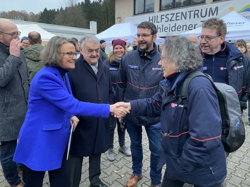 Der Bundesbeauftragte der Malteser Fluthilfe, Wolfgang Heidinger, dankte den kooperierenden Partnern sowie den Malteser-Kolleginnen und Kollegen für ihr kontinuierliches Engagement im HIZ. Heidinger überreichte Bürgermeister Pfennings als Geste der Wertschätzung eine Malteser Dankplakette der Deutschen Assoziation des Souveränen Malteser Ritterordens. Als politisch Verantwortlicher habe sich Pfennings in der Katastrophenlage mit ganzem Herzen und voller Kraft eingesetzt, so Heidinger. Durch viel Kommunikation und Nähe zum Menschen habe er Vieles bewirkt. Das Schleidener Verwaltungsoberhaupt war gerührt. „Mich erlebt man selten sprachlos“, sagte der Bürgermeister erfreut und bedankte sich für die Plakette.