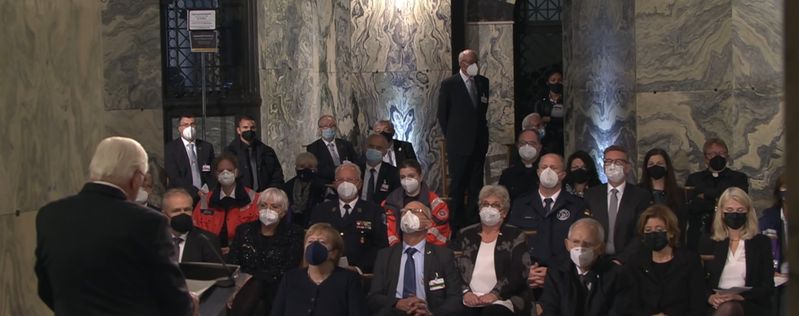 Steinmeier dankte für die "überwältigende Hilfsbereitschaft". Einsatzkräfte von Feuerwehr, DLRG, Polizei, Rotem Kreuz, Maltesern, Johannitern, Bundeswehr und Technischem Hilfswerk hätten bis zur vollkommenen Erschöpfung geholfen. Sein Dank gelte auch Bürgermeistern, Verwaltungsmitarbeitern und den vielen freiwilligen Helfern und Spendern. Der Bundespräsident mahnte in seiner Ansprache zu Tempo bei den Hilfen für die Menschen in den Flutgebieten.