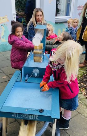 Beim „Wellenspieler“ handelt es sich um verschiedene, mit Leitungen und Röhren aneinandergefügte Spielbecken, die mit einem geschlossenen Wasserkreislauf miteinander verbunden sind. Das Wasser kann darin fließen und gestaut werden kann. „Das neue Spielzeug war kaum aufgebaut, als die Kinder bereits voller Begeisterung Besitz davon ergriffen hatten“, berichtet Kita-Leiterin Sabine Dohm. Durch unterschiedliche Funktionen können Wellen und Fontänen erzeugt und genau studiert werden. Außerdem können die Kinder nach Herzenslust mit den Händen im Wasser planschen.