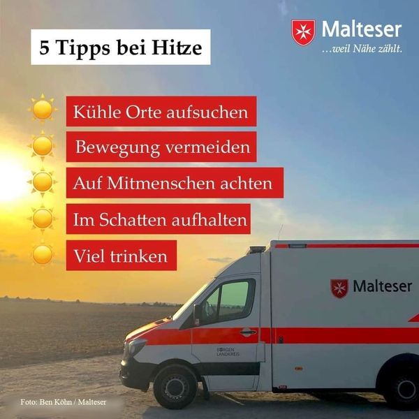 Köln. Hitze gehört zum Sommer dazu. Doch extreme und andauernde Hitze kann vor allem für ältere Menschen gefährlich werden. Die Malteser geben Tipps, wie man sich an solch warmen Tagen vor Dehydrierung oder Hitzschlag schützen kann. Jeder weiß, dass gerade ältere Menschen viel trinken sollten – nur: wie trinke ich richtig? Dr. Rainer Löb, Bundesarzt der Malteser, rät: „Trinken Sie ausreichende Mengen, das können auch schon einmal zwei bis drei Liter am Tag sein.“ Denn bei heißen Temperaturen verlieren wir durch Schwitzen deutlich mehr Flüssigkeit, und daher auch Salze wie Elektrolyte. Daher sollte man trinken, bevor man durstig wird. Am besten geeignet sind Mineralwasser, Säfte als Schorle oder ungesüßte Tees wie Früchte- oder Kräutertee – am besten nur leicht gekühlt oder lauwarm. Mineralwasser hat auch als Leitungswasser in Deutschland eine gute Qualität und enthält genügend Salze/Elektrolyte. Nicht geeignet hingegen ist Alkohol. Denn Alkohol erweitert die Blutgefäße und es kann zu Schwindelgefühlen bis hin zur Bewusstlosigkeit oder einem schnellen Herzschlag kommen.