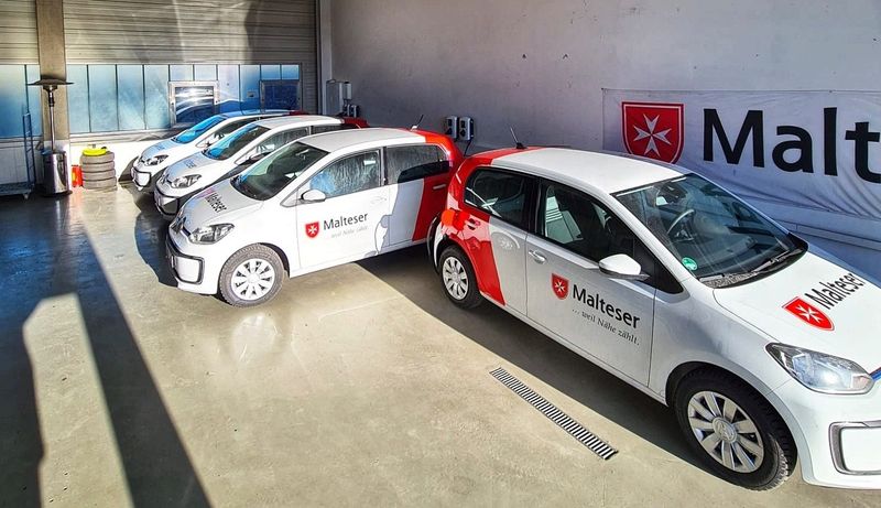 „Wir mussten leider länger warten als gehofft. Die Lieferschwierigkeiten im Automobilsektor haben auch unsere Planungen betroffen“, berichtet Dienststellenleiter Christian Bruno. Die entsprechenden Wallboxen waren schon vor Monaten in der Fahrzeughalle installiert. Jetzt hängen dort regelmäßig die vier im Malteser-Design beklebten e-Ups am Strom.