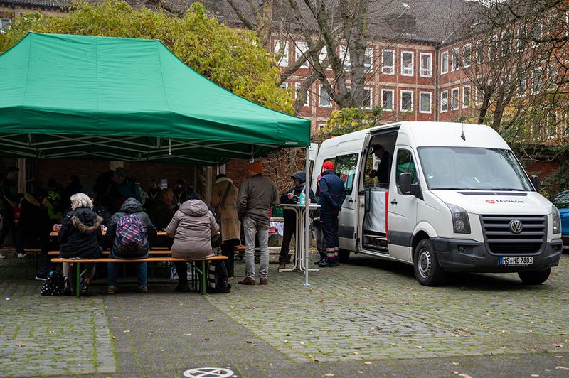 Von November bis Ende März sind die Malteser vom Stadtverband Münster jeden zweiten Sonntag auf den Beinen, um ein warmes Mittagessen an wohnungslose Menschen auszugeben. Das Projekt wird komplett aus Spenden finanziert und rein ehrenamtlich getragen.